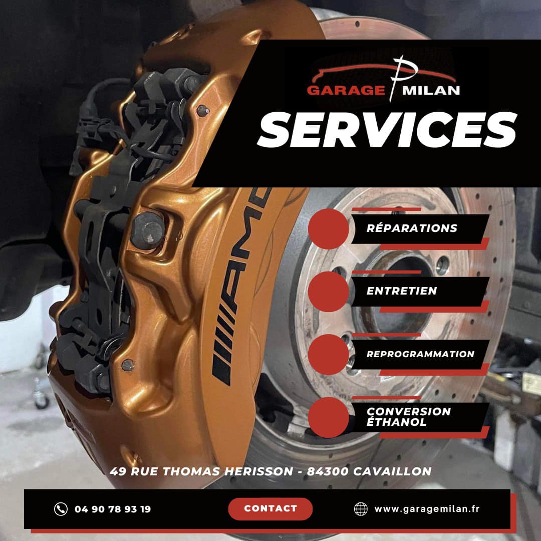 Garage Milan à Cavaillon 84300 et sur NOVES 13550, vous propose des services de réparations automobiles, véhicules légers ou utilitaires, reprogrammation moteur, conversion bioethanol E85, remplacement pneumatiques et aussi la vente de véhicules d’occasion.